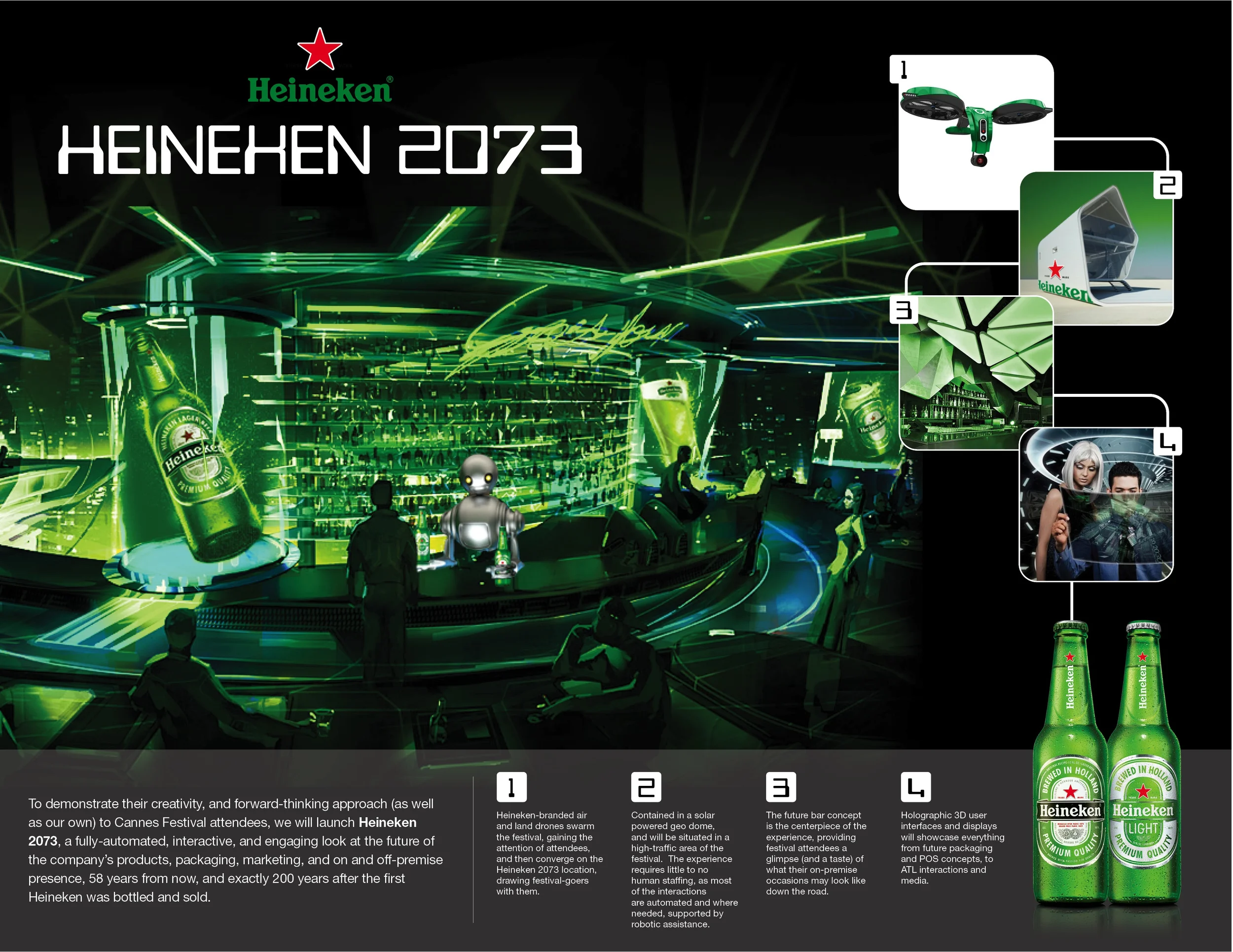 When the brand came to us looking for ideas for their planned presence at the Cannes Lions Festival, I came up with a concept called Heineken 2073, which incorporated cutting-edge tech including robotics, drones, multi-touch interfaces and sustainable energy to help envision how the brand may look and market itself 200 years after its creation.